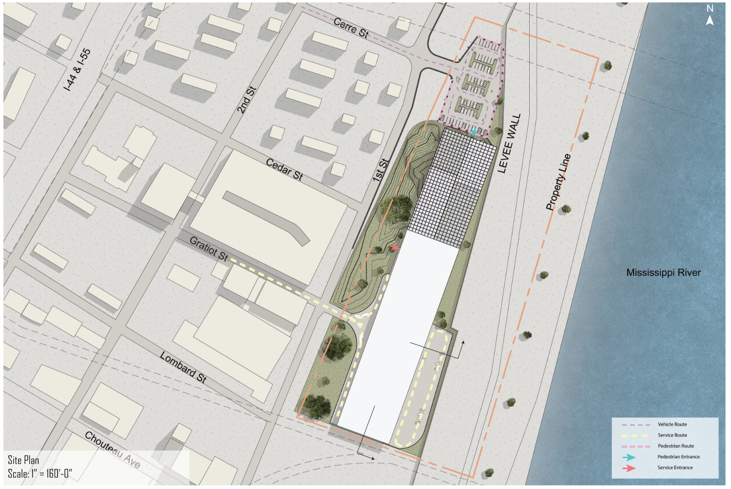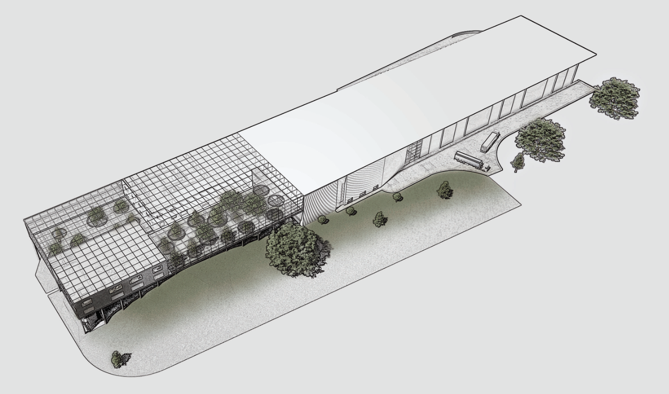 The Steel Structure is a center for steel fabrication and education located in St. Louis, Missouri. The center celebrates its historically German roots with its name and biophilic construction techniques through the connection to the landscape. This is done through floor penetrations for pre-existing trees to continue to thrive in the air controlled garden space of the center. Their oxygen emissions are filtered into the central air system and is returned with the carbon dioxide emissions naturally transferred by the return air registers of the mechanical system.