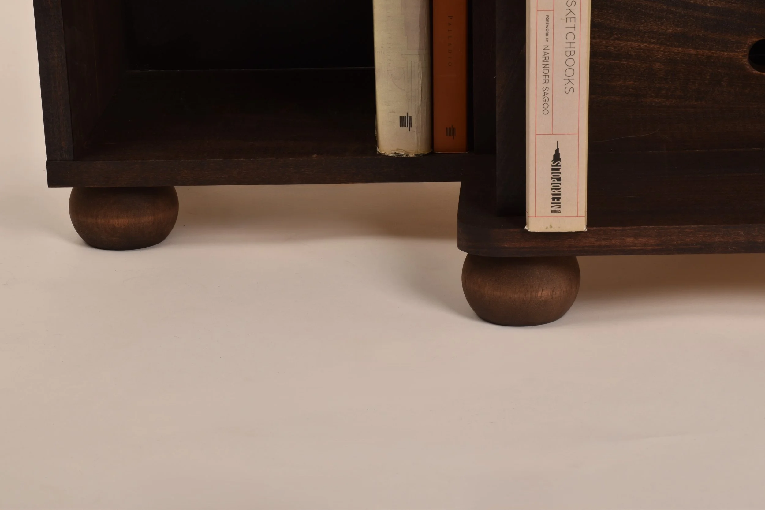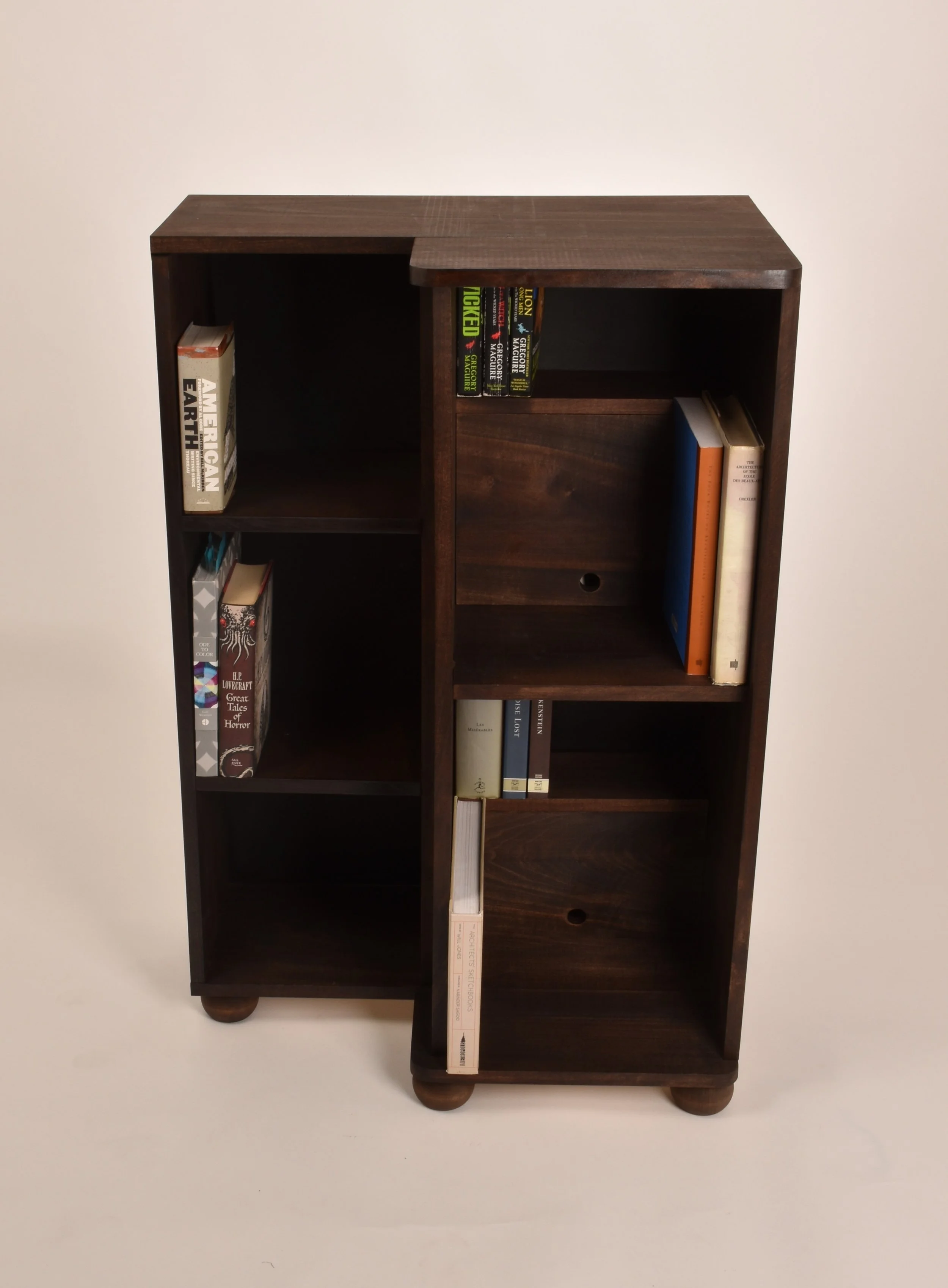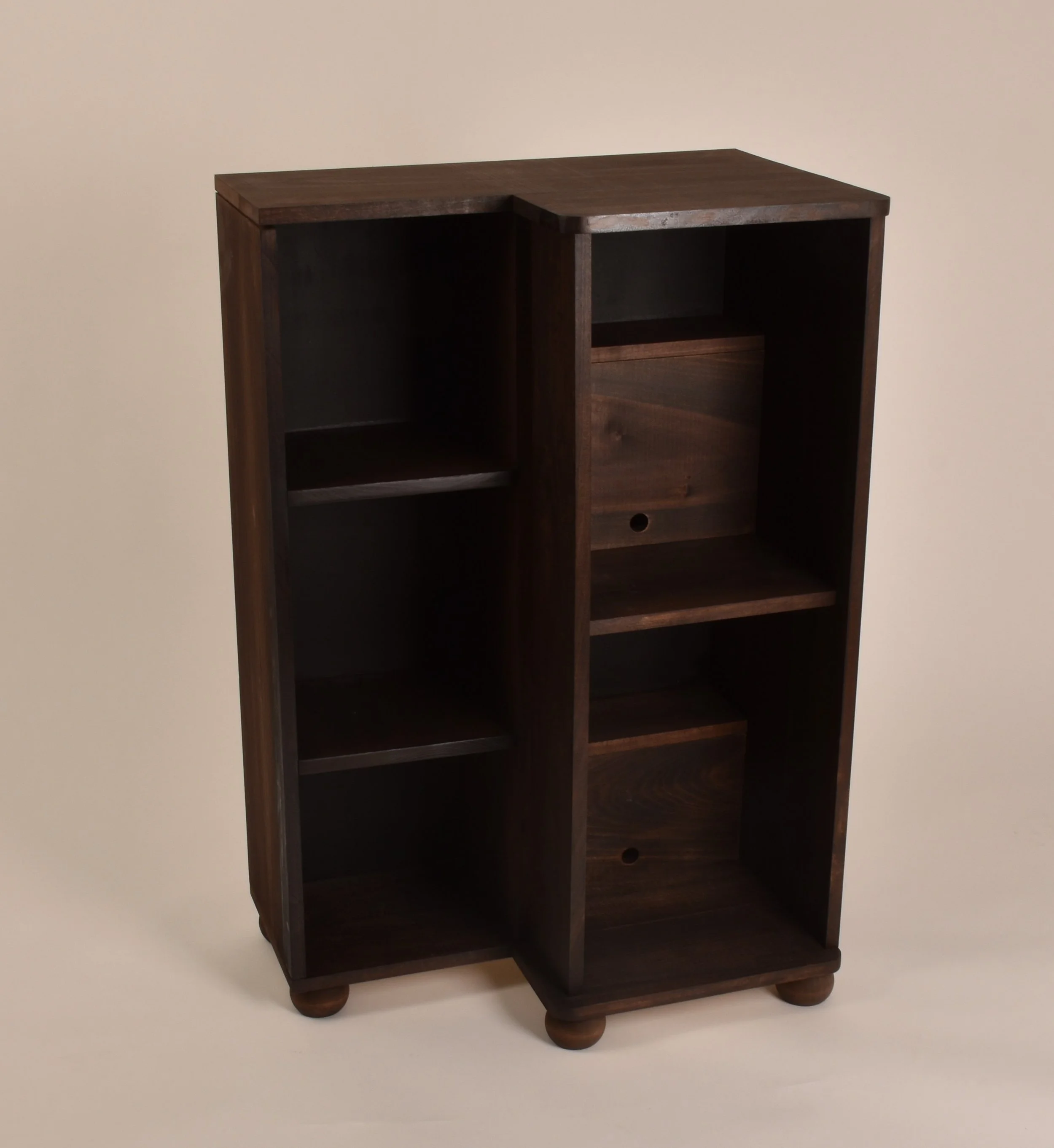 This furniture piece was inspired by the concept of lost space in a tall bookcase. The varying heights and depths of the shelves allows double the book storage and provides space for two hidden compartments.